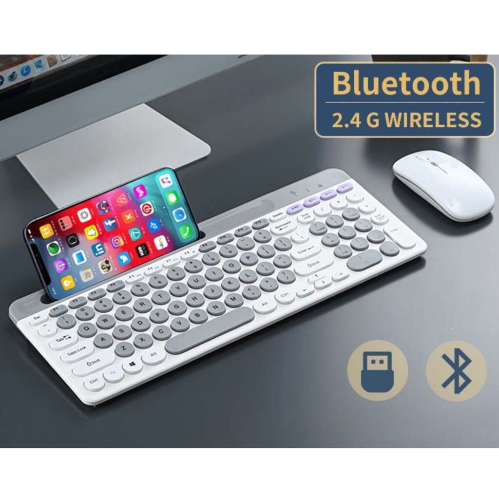 El teclado cuenta con 104 teclas redondas, diseño elegante y conectividad 4 en 1 (2.4G + 3 Bluetooth) con alcance de hasta 10 metros. Su batería incorporada de 400mAh se recarga fácilmente por puerto Tipo C e incluye guía para celular integrada.