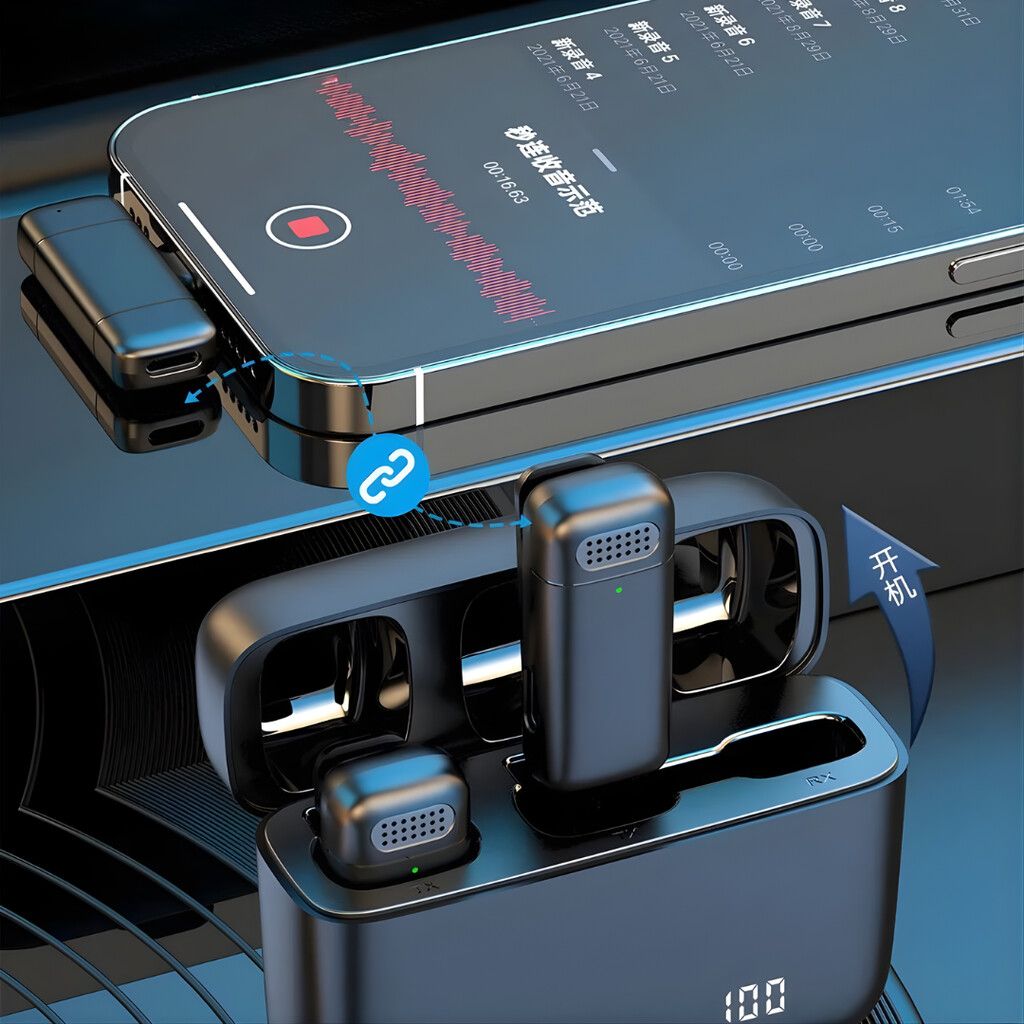 Este set incluye dos micrófonos inalámbricos con estuche de carga inteligente, ideal para grabaciones, transmisiones o creadores de contenido. Cada micrófono cuenta con batería de 80mAh, mientras que el estuche ofrece 300mAh adicionales, asegurando hasta 5 horas de uso continuo.
