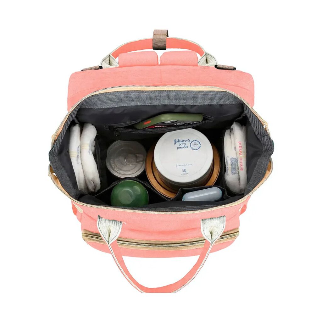 Mochila práctica y espaciosa para llevar todo lo que tu bebé necesita. Incluye bolsillo frontal térmico para mamaderas, bolsillos laterales de acceso rápido, interior organizado con separadores y porta chupete. Posee puerto USB externo para conectar un powerbank y se convierte en cunita portátil o cambiador, ideal para usar en cualquier lugar.